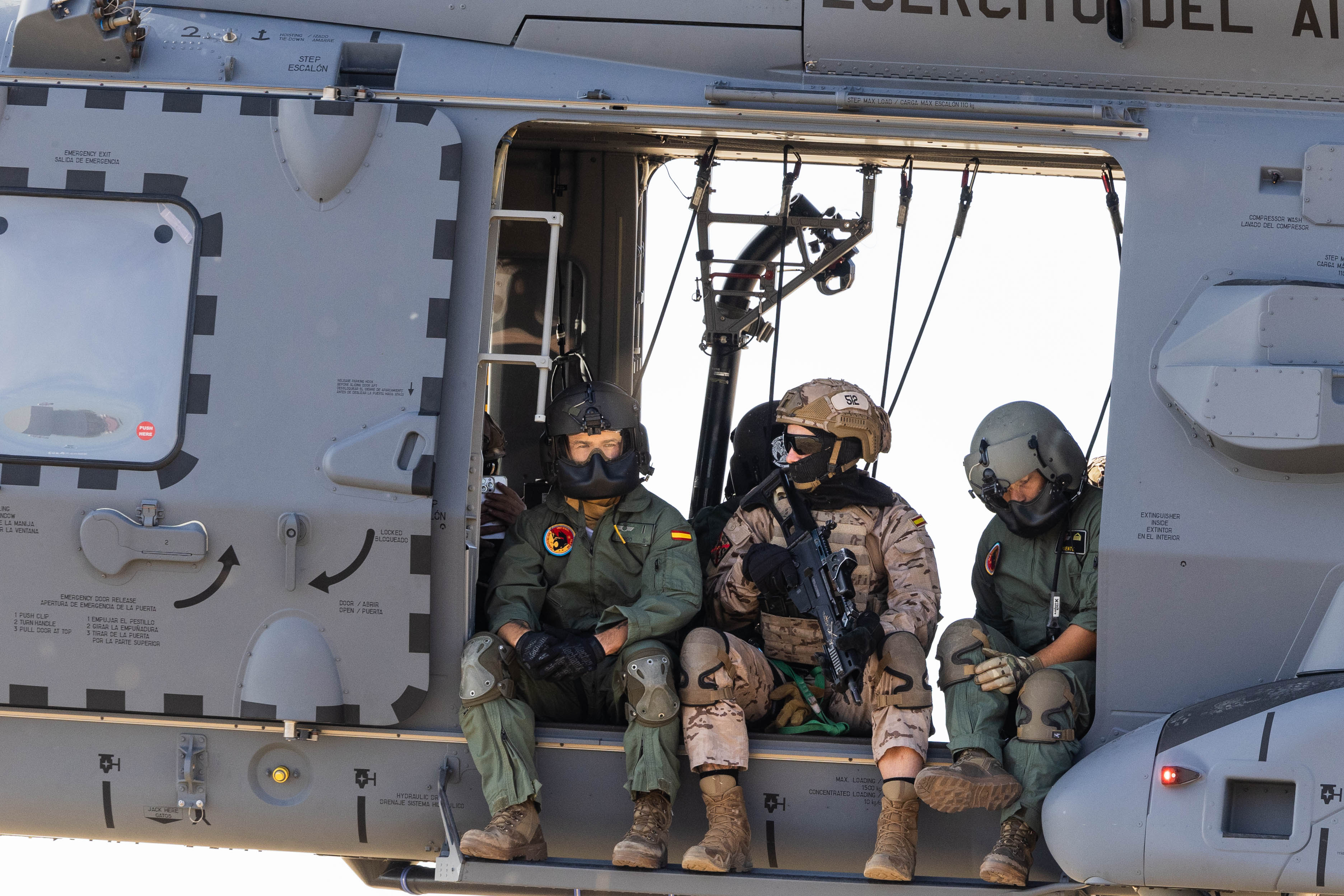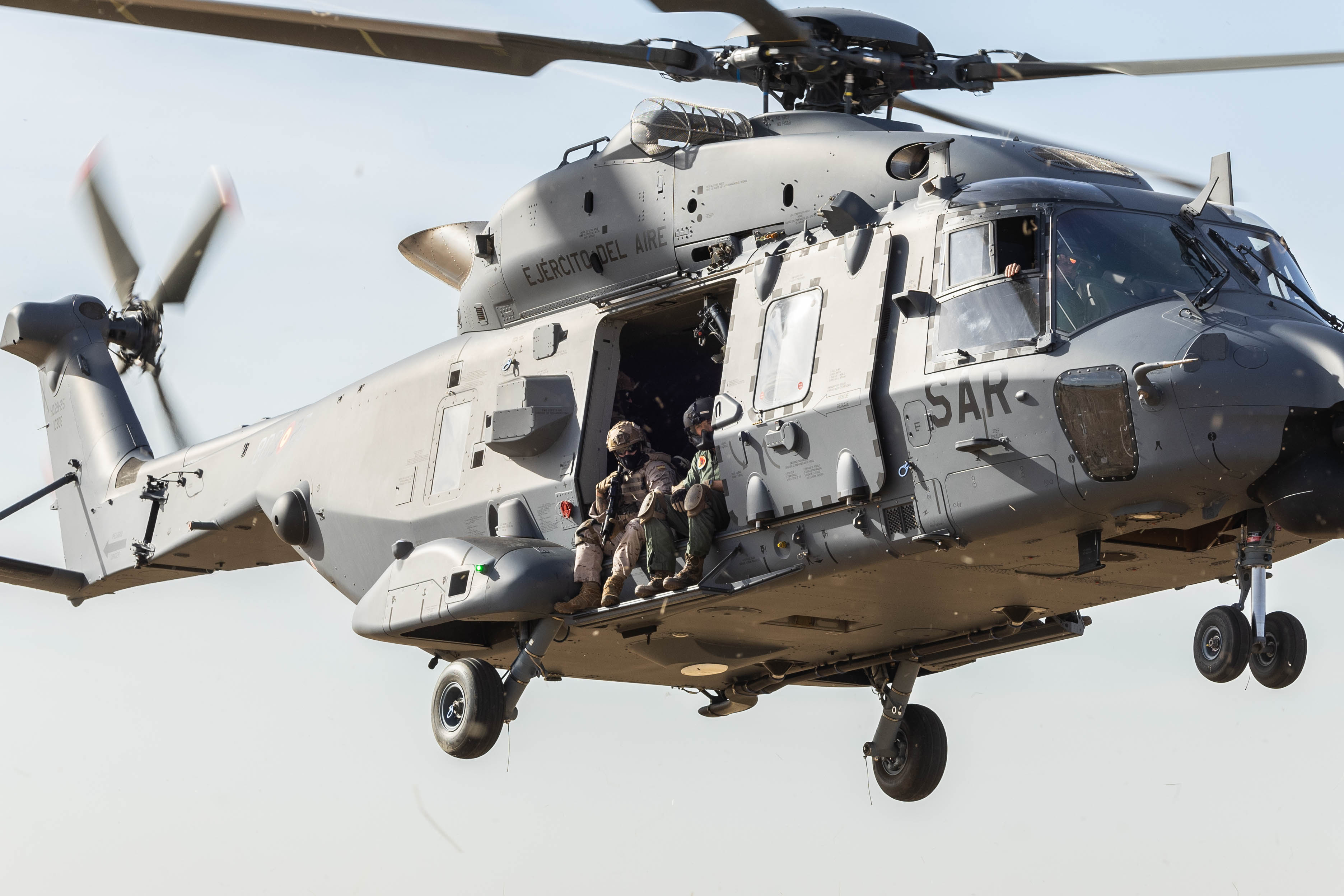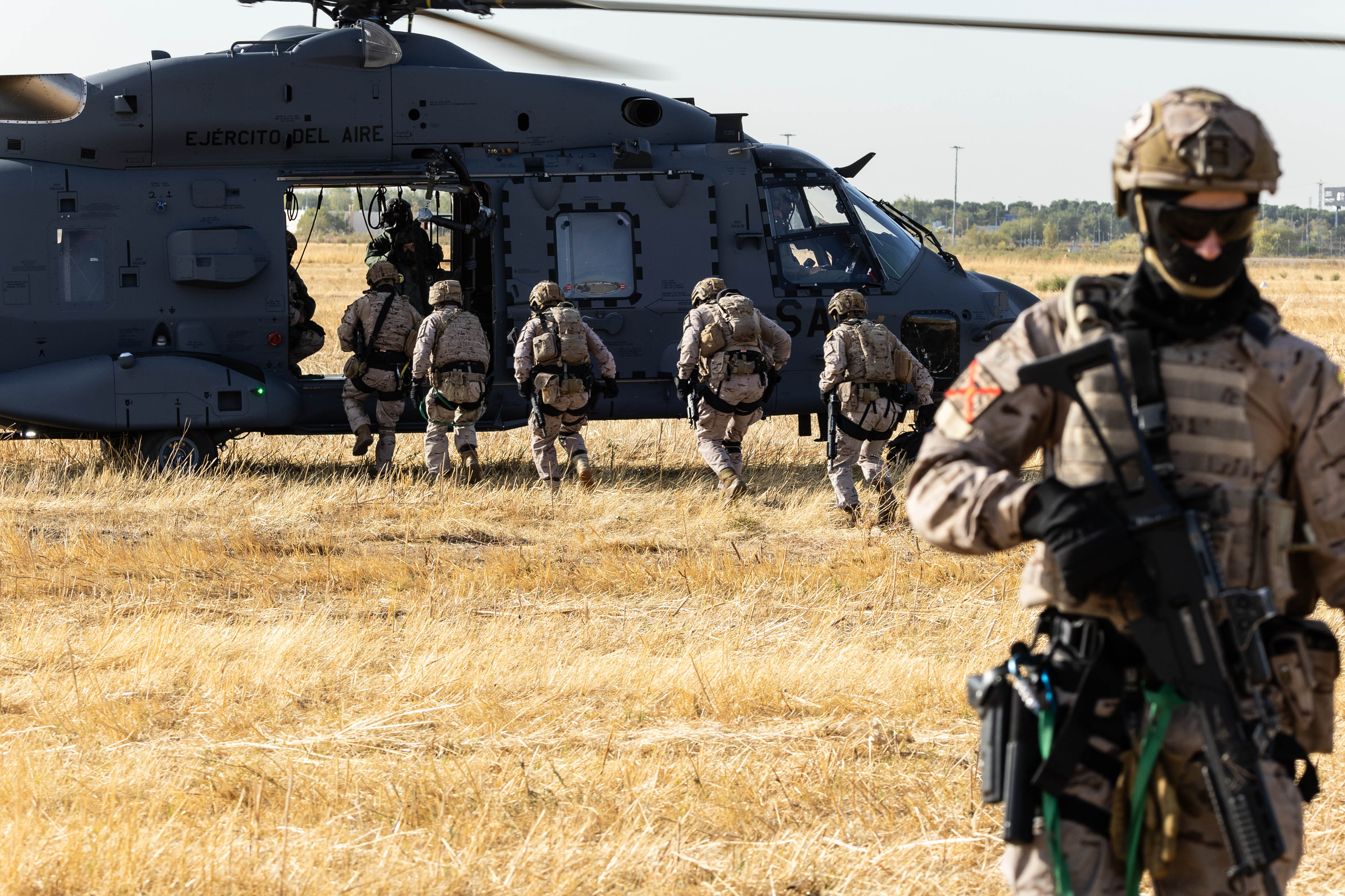Poco a poco un lejano rumor se va haciendo cada vez más intenso. En unos pocos segundos el estruendo es ensordecedor. Miles de briznas de hierba seca vuelan y nos golpean en la cara. El viento que producen las palas del rotor casi nos impide mantenernos en pie. Es el NH-90 Lobo, el helicóptero de operaciones especiales y rescate en combate del Ala 48 del Ejército del Aire y del Espacio.